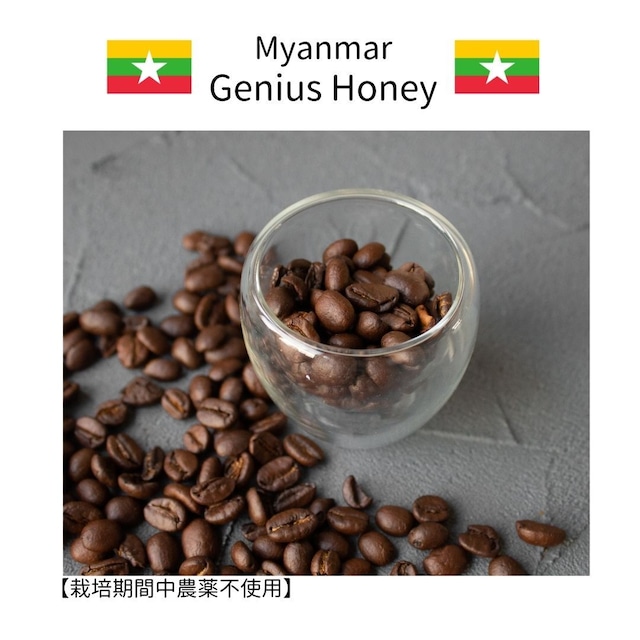 品名:ミャンマー ジーニアス ハニー 地域:シャン州 ユアンガン地区 認証:なし(栽培期間中無農薬) 品種:カツーラ、カツアイ、サンラモン 精製:レッドハニー 焙煎度:深煎り 酸味★★☆☆☆ コク★★★☆☆ 苦味★★★★☆ 甘み★★★☆☆ ダークチョコのような味わい 煎りを深くして酸味を抑えました 甘さの余韻が長く続くコーヒー
